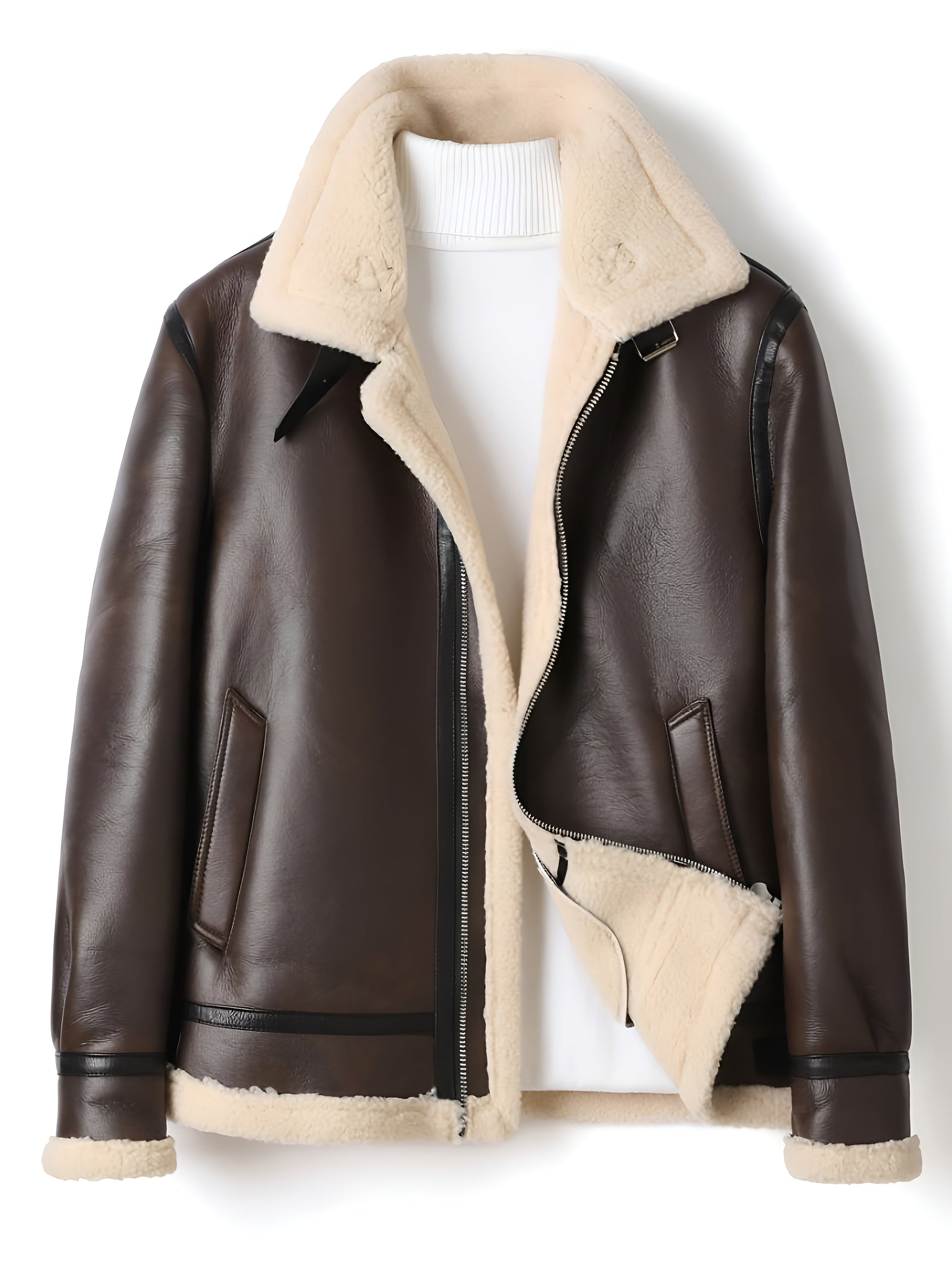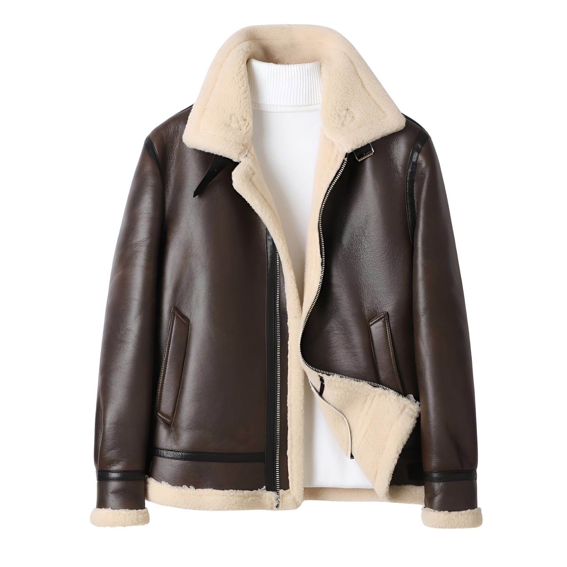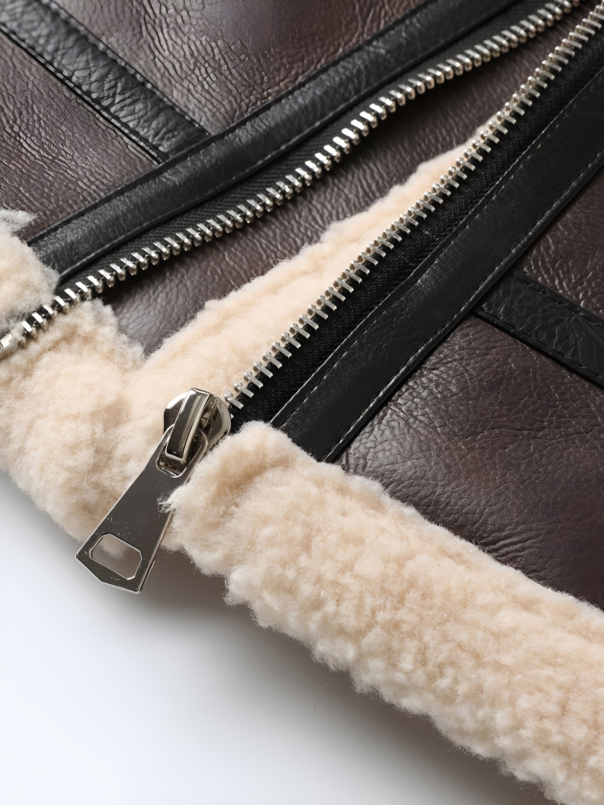 Verfijn je garderobe met dit diepbruin leren motorjack, gevoerd met een genereuze schapenvacht binnenkant. Ontworpen om bescherming en comfort te bieden, omhult het de silhouette met warmte terwijl het een tijdloze en verfijnde stijl uitstraalt. Een karakteristiek stuk dat je met vertrouwen vergezelt zodra de temperaturen dalen.